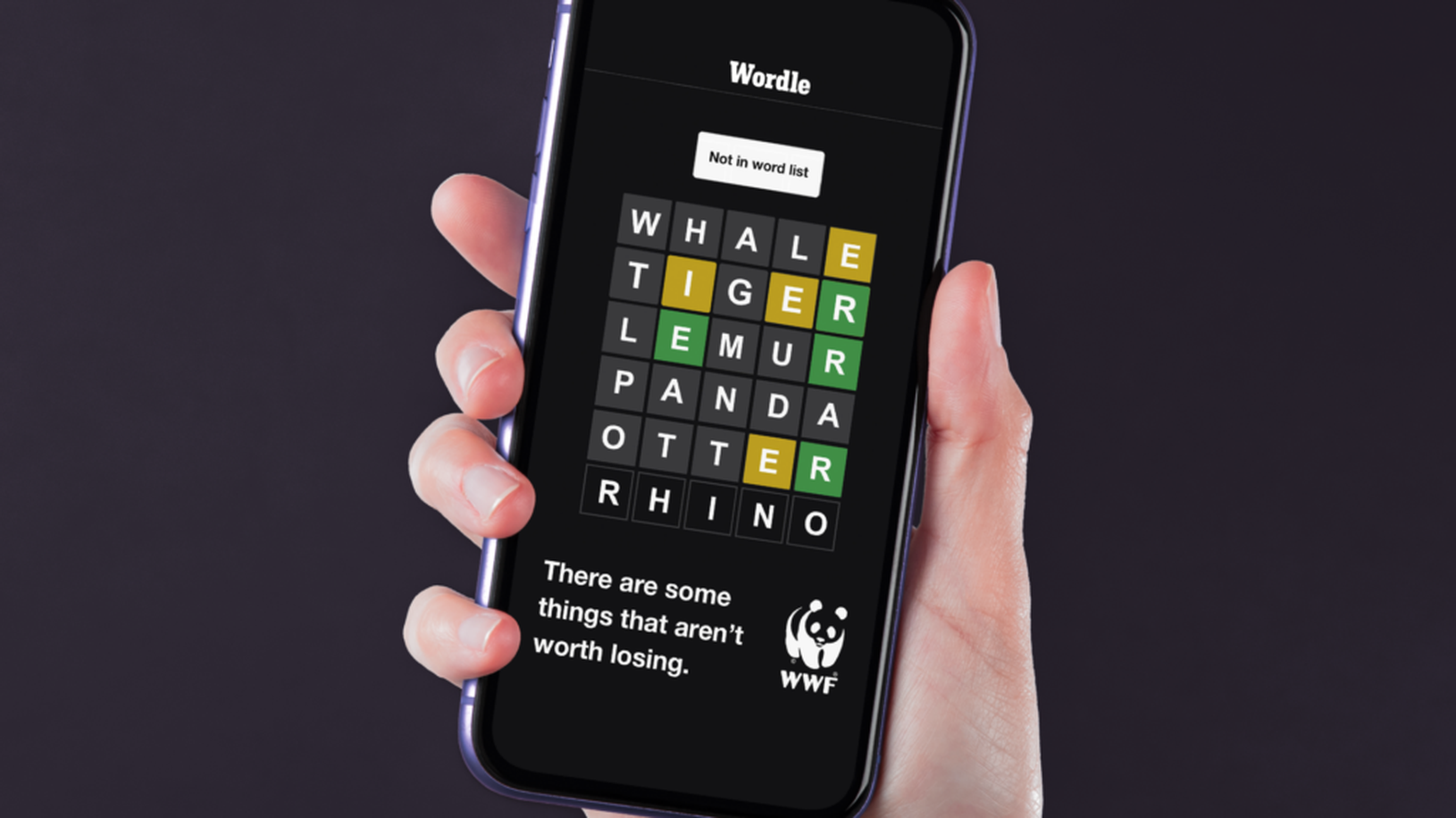 This ad for WWF plays on the viral online game, Wordle, to highlight the increasing number of endangered species going extinct. The twist? The user’s final guess prompts the error message, ‘Not in word list’. It highlights that, with drastically declining rhino numbers, the word may no longer exist in our vocabulary - and the fate of the others may not be far behind.