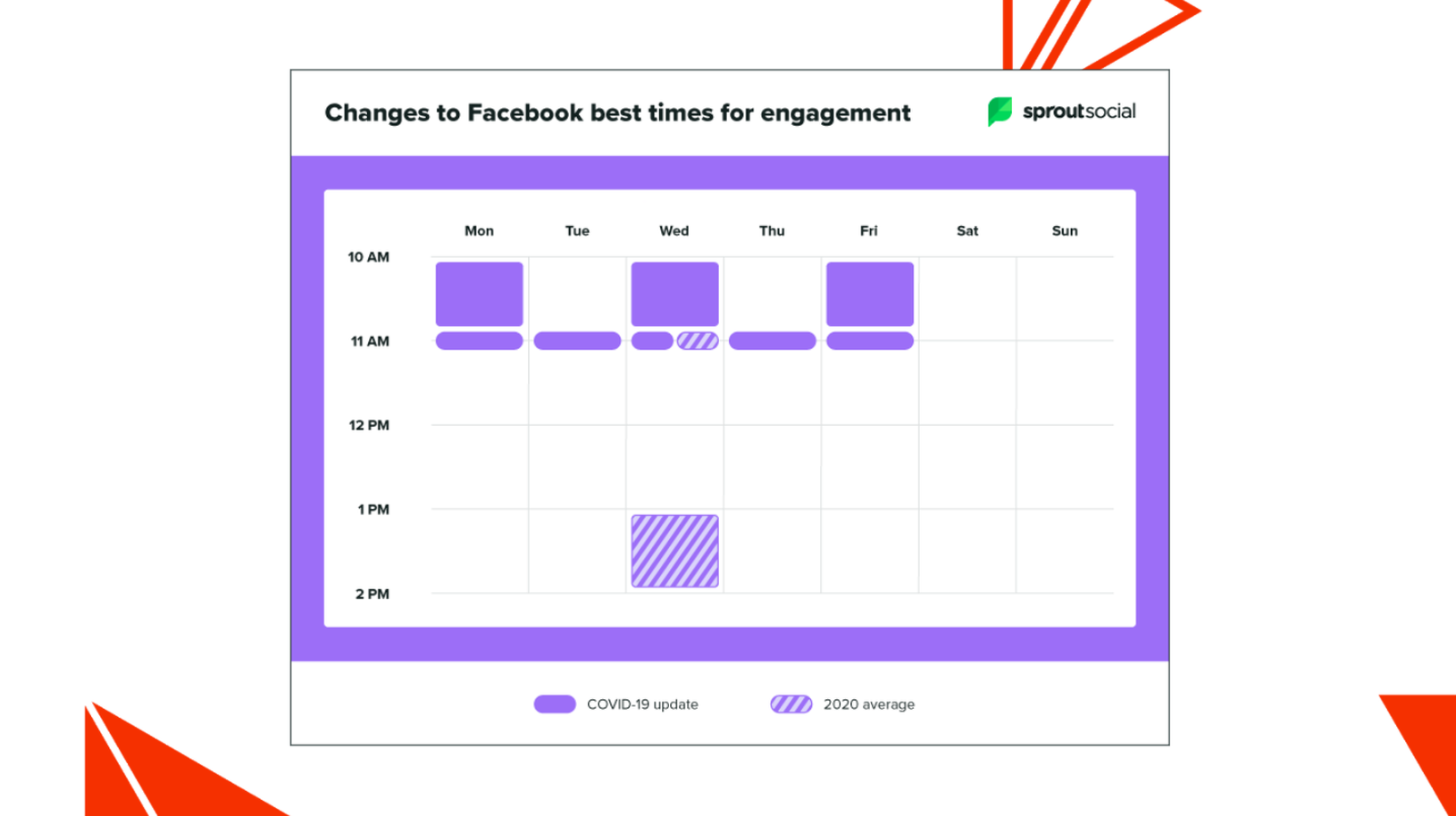 For example, this insight from Sprout Social shows that on Facebook, the popular Wednesday slots for top engagement have opened right up to include Monday and Friday too, with smaller windows appearing on Tuesday and Thursday too. The stripy boxes are pre-COVID-19 hotspots, while the solid boxes show additional lockdown slots.
